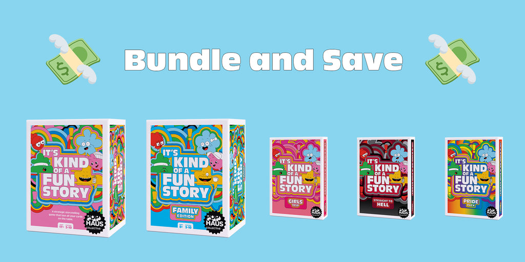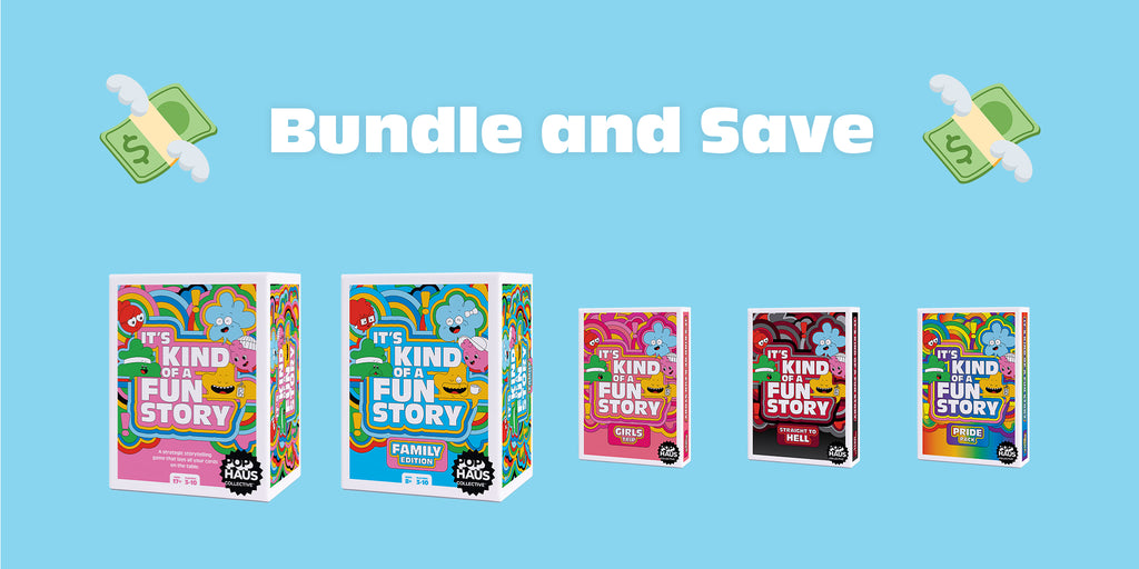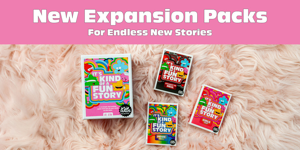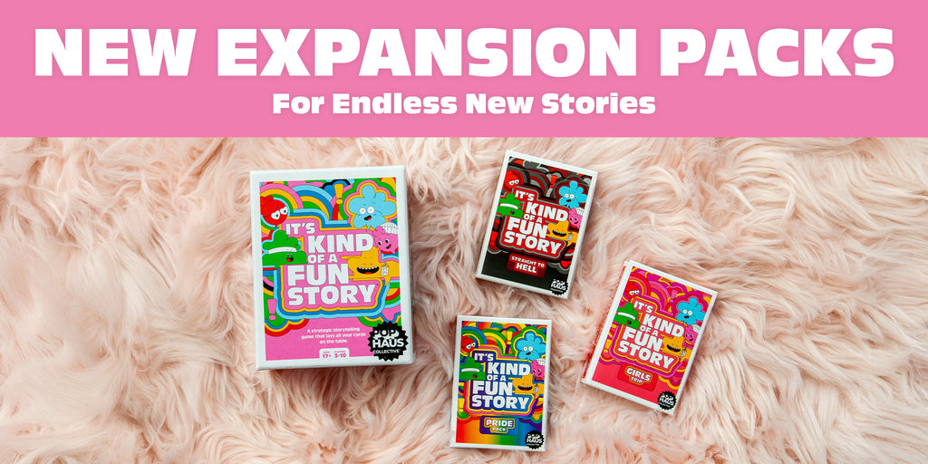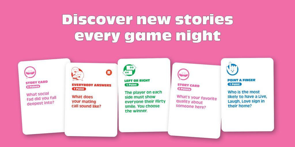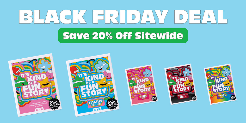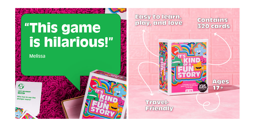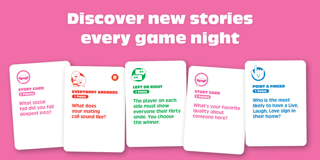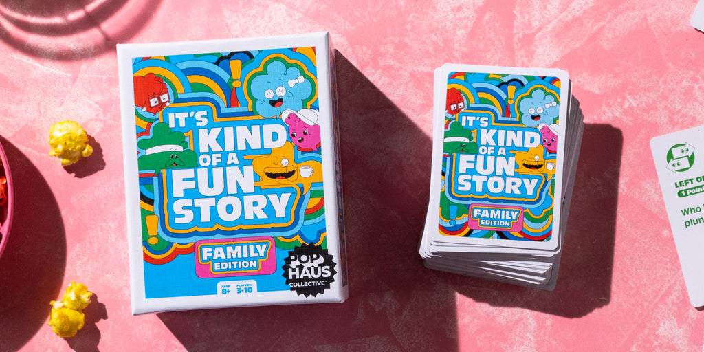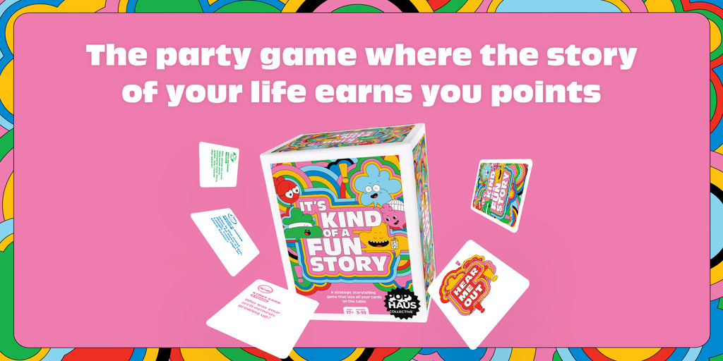 The game is simple. Players take turns drawing from a deck with—you guessed it, story prompts. Reading each out loud they can choose to share a story or skip. But, be careful, with every skip also comes the risk for another player to jump in and claim points. First player to seven points takes the win.