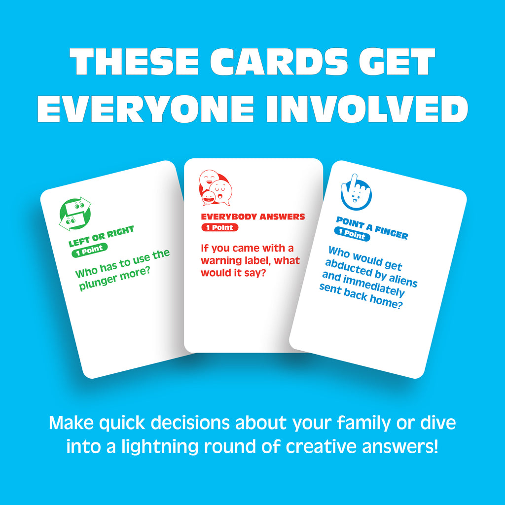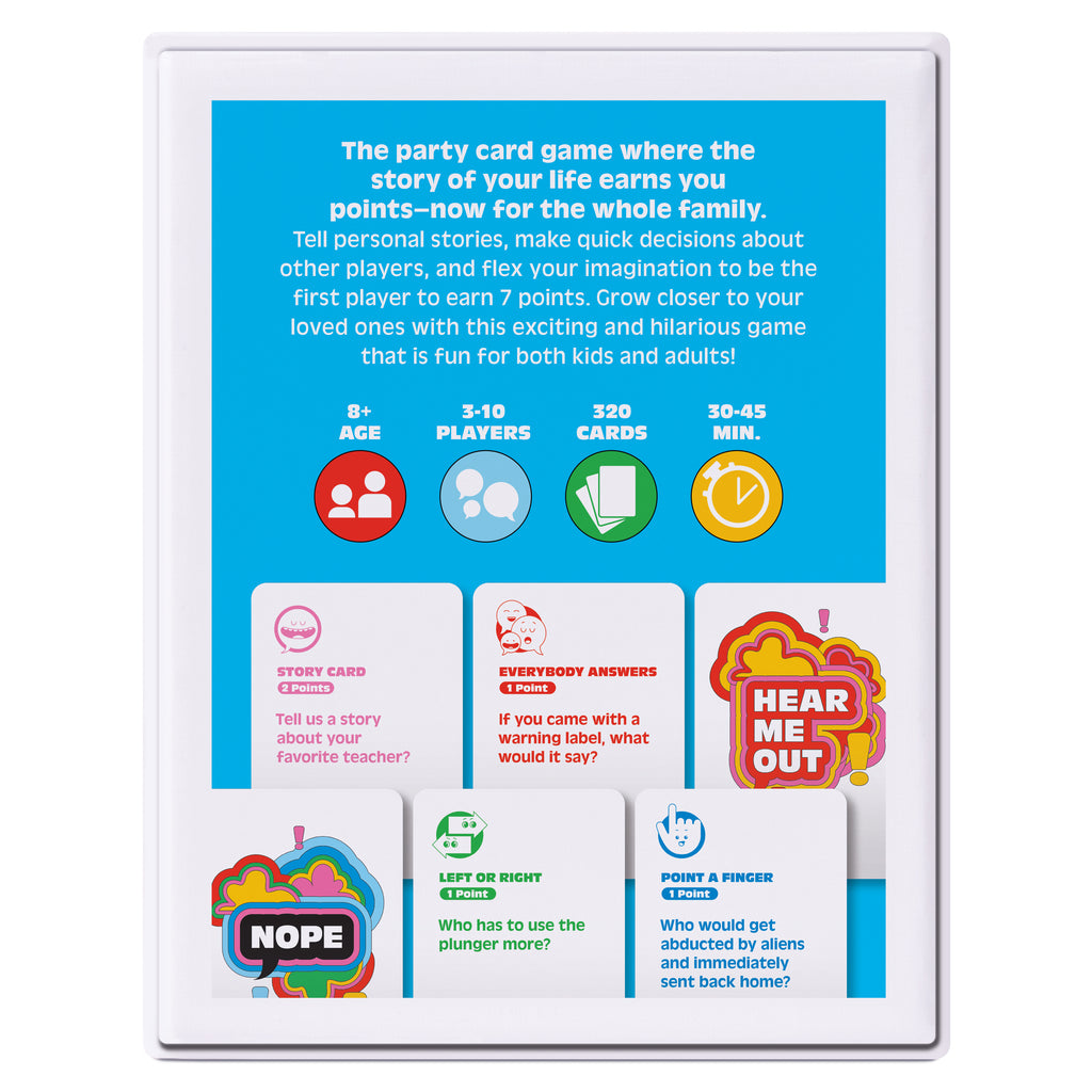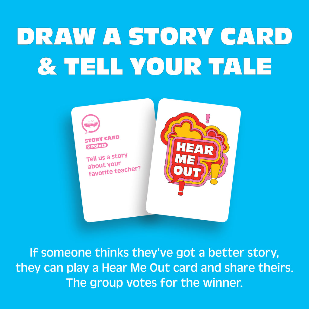 EASY TO LEARN, FUN TO PLAY: Take turns drawing cards and answering questions to be the first player to earn seven points! Story Cards put you in the spotlight to share your story, but watch out, if another player thinks they have a better tale, they can play a Hear Me Out Card to try to steal your points. Left or Right, Point a Finger, and Everybody Answers cards make every round fast, fun, and full of surprises. This storytelling and kids game keeps everyone engaged from start to finish.